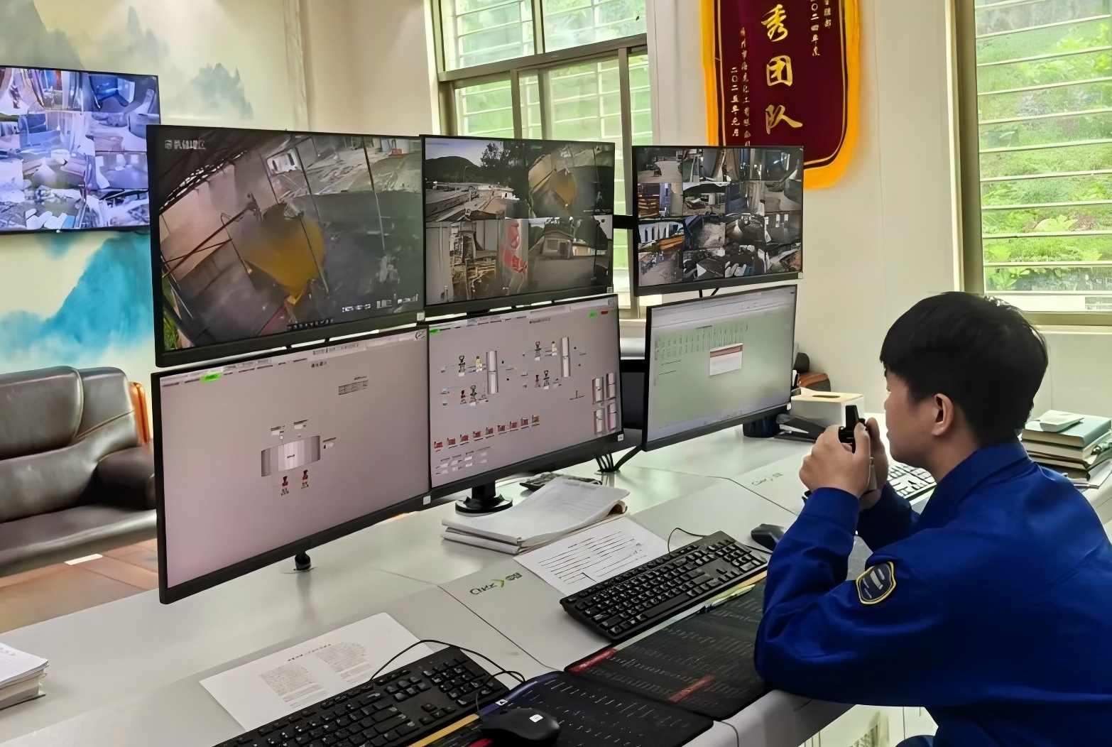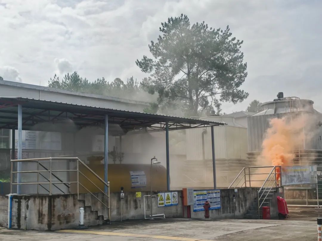 本次演練模擬化工廠液氨儲罐出料管道破裂,導(dǎo)致大量液氨發(fā)生泄漏并引發(fā)火災(zāi)。上午9時30分,中控室操作員在值班室突然聽到氣體報警器發(fā)生報警聲,立即查看視頻監(jiān)控,發(fā)現(xiàn)液氨儲罐出料管道冒出大量白煙,且觸發(fā)連鎖噴淋裝置,意識到液氨發(fā)生泄漏。情況非常緊急,該操作員立即上報公司應(yīng)急總指揮。