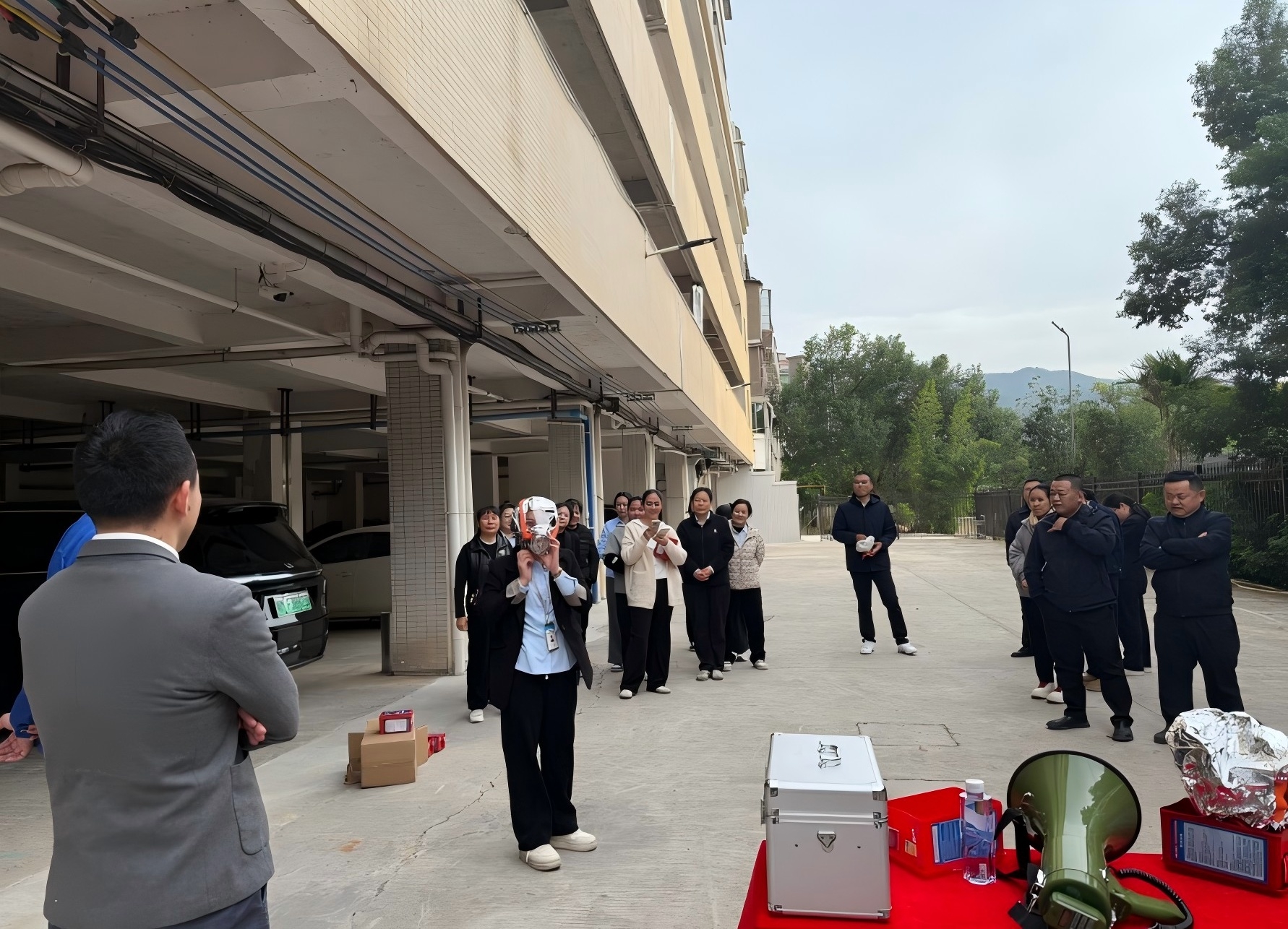 由指導員向大家講解使用滅火器及面罩的方法及注意事項,并安排每人依次進行滅火器滅火操作。